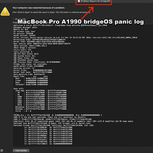 A panic log shows BridgeOS panic, which drives the Touch Bar.