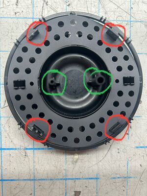 Reinstall the screws and the cap, ensuring the different sized pegs on the cap go into the appropriate holes (circled green below and in photo for step #2 above).