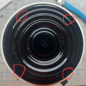 Step 1. Pry open the top cover. The cover is held on with 4 plastic clips (located at approximately the red circles in photo below). The main body can be squeezed by hand slightly to relieve some pressure from an opposing set of clips and the cap can be pried up in those spots with a flathead screwdriver inserted in to a vent opening (a paint can opener works great for this as it allows you to pull up on the lid without putting pressure on the lip of the main body).