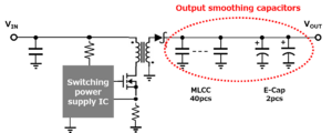 Capacitors are used at the input/output stage of DC-DC voltage converters. DC-DC converters inherently produce pulsating or "ripple" DC output voltage due to the switching action of electronic components. Capacitors are employed to filter and smooth this output by storing and releasing electrical energy, reducing voltage fluctuations and ensuring a more stable DC voltage as shown in Figure 3