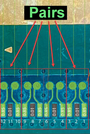 The pairs are groups of two identical diode readings, always separated by a ground reading.